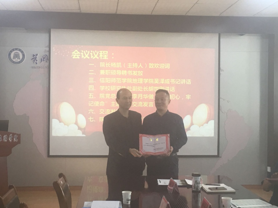 首先,杨凯院长致欢迎词,欢迎吴泽成书记一行,并介绍了黄冈师范学院及地理与旅游学院的基本情况。吴泽成书记介绍了信阳师范学院和yL23411永利vip官网登录入口发展历史、师资队伍、专业教学、科研业绩、社会服务等现状及发展形势,并为被聘为永利官网的3名兼职教育硕士研究生指导教师关江华、黄勇奇、胡红兵颁发了聘书。胡世刚副处长讲话,希望双方加强交流合作,特别是在研究生培养方面信阳师院应给予黄冈师院大力支持和帮助。