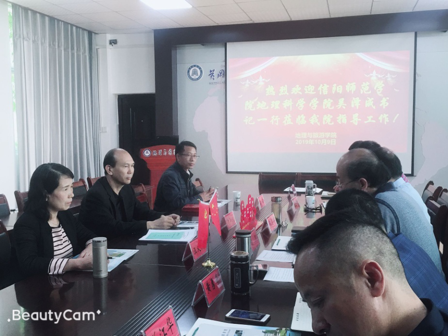 2019年10月9-10日,yL23411永利vip官网登录入口党委书记吴泽成、副院长王义民、地理科学专业负责人颜俊博士前往黄冈师范学院地理与旅游学院进行“不忘初心,牢记使命”主题教育交流和硕士研究生招生宣传。黄冈师范学院研究生处副处长胡世刚、地理与旅游学院党委书记李月华、院长杨凯等班子成员以及部分教授、博士参加交流。