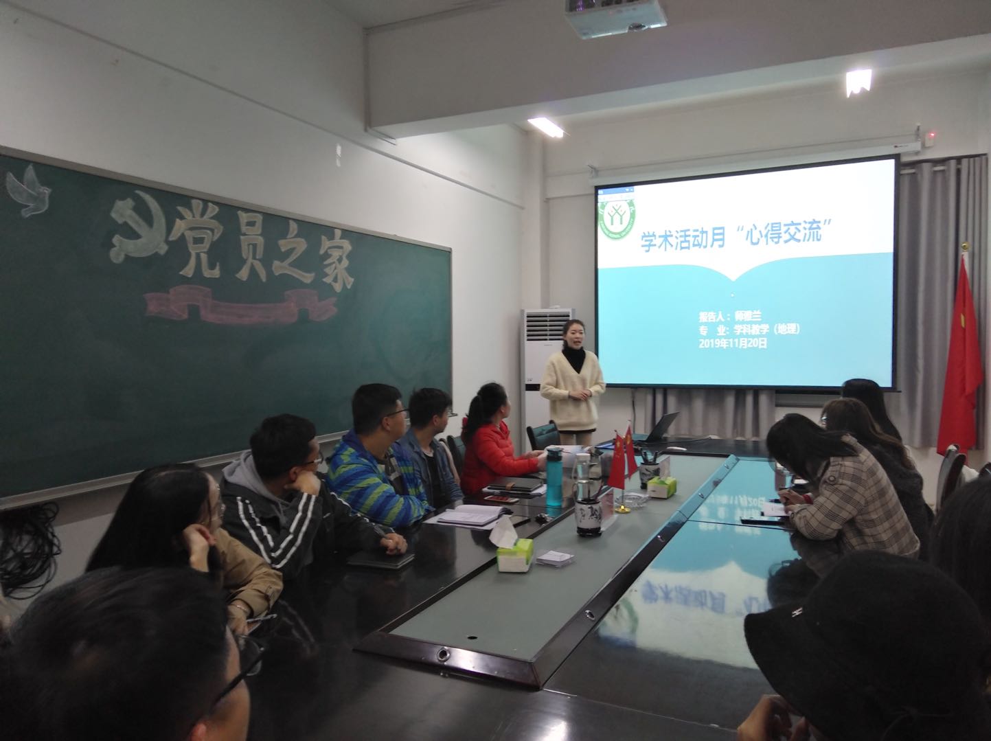 2019年11月20日,yL23411永利vip官网登录入口于理科楼南楼403室召开2019年硕士研究生国家奖学金经验交流会议。交流会由国家奖学金获得者、2018级学科教学·地理专业师雅兰主讲,yL23411永利vip官网登录入口全体在校研究生参加了此次交流会,会议由分会主席崔越主持。