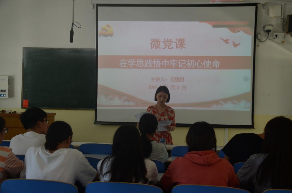 党课伊始,艾甜甜带领全体成员一同学习了习近平关于“不忘初心,牢记使命”的重要讲话精神。她根据自己对初心使命的理解向参会人员就如何在今后的生活中提高党性修养,牢记使命提出具体的建议和做法。她指出,党员同志在学思践悟中牢记初心使命,就要不停地学,不停地践,在实践中学,在学中实践。用心学习、用心体会,在学思践悟中融会贯通,在考验磨砺中提高觉悟,真正内化于心、外化于行。