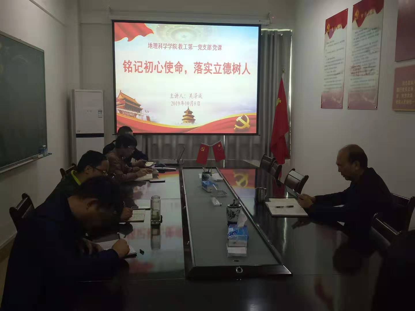 10月8日,yL23411永利vip官网登录入口党委书记吴泽成在理科楼南403会议室以“铭记初心使命、落实立德树人”为题,为教工第一党支部全体党员开讲主题教育专题党课。