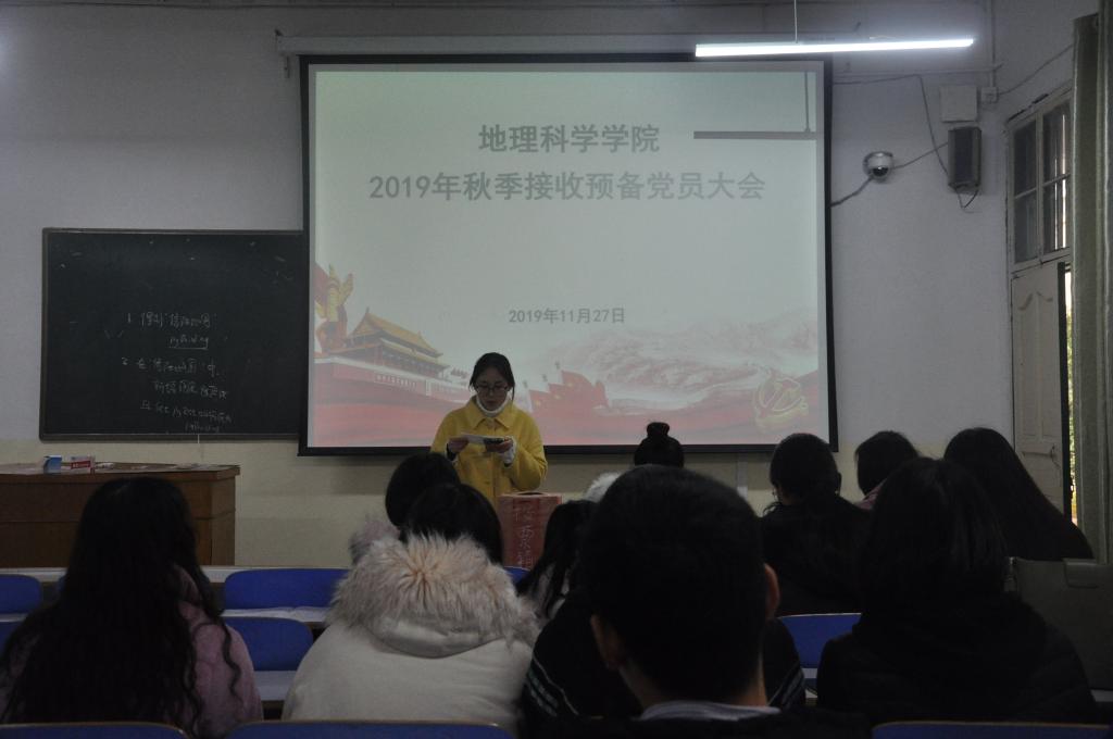 会议伊始,杨辉对会议内容和主要流程作简要阐述并宣读预备党员发展名单。张世可等七名发展对象依次上台宣读入党志愿书,汇报自己对党的认识、入党动机、现实表现、本人履历以及需要向党组织说明的问题。入党介绍人贡恩军同志向与会成员介绍发展对象情况以及培养教育过程,并对其能否入党表明意见。经委员会讨论,委员一致认为张世可等同志基本具备党员条件,随后,与会党员对张世可等七位发展对象是否能够入党进行无记名投票表决。杨辉宣布投票结果,大会同意接收张世可等七位发展对象成为中国共产党预备党员。
