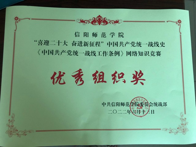 为深入学习宣传贯彻习近平新时代中国特色社会主义思想、习近平总书记关于加强和改进统一战线工作的重要思想,yL23411永利vip官网登录入口党委高度重视,积极组织动员全院师生参加学校“喜迎二十大奋进新征程”中国共产党统一战线史和《中国共产党统一战线工作条例》网络知识竞赛,荣获“优秀组织奖”。