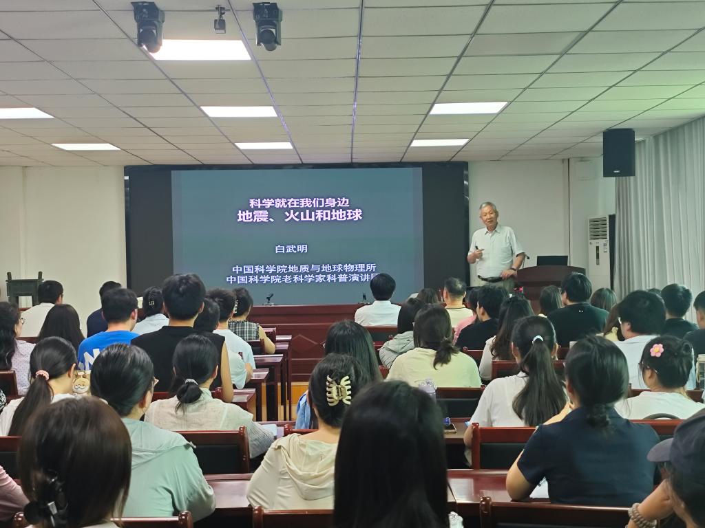 2025年6月9日,应信阳市科协和yL23411永利vip官网登录入口邀请,中国科学院地质与地球物理研究所白武明教授,于理科楼南楼410会议室为学院师生作了题为“科学就在我们身边——地震、火山和地球”的学术报告。信阳市科协党组成员、副主席张俊,信阳市老科协常务副会长兼秘书长张善伟、秘书处工作人员张冬梅,yL23411永利vip官网登录入口副院长颜俊、闫军辉,青年教师、研究生和本科生100余人参加报告会,会议由闫军辉主持。
