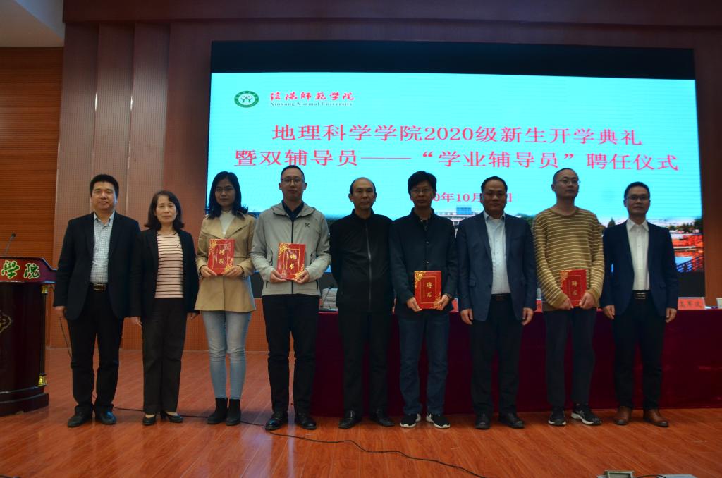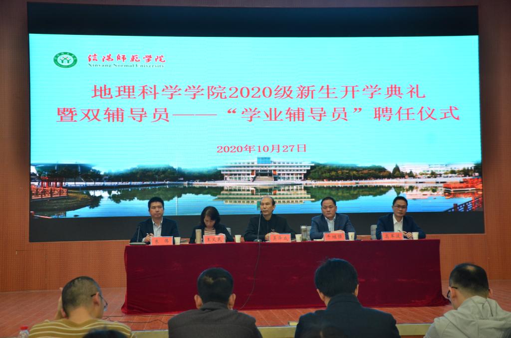 典礼伊始,牛院长为典礼致辞。他首先对新生的到来表示欢迎和祝贺,简要介绍了信阳师范学院yL23411永利vip官网登录入口的发展历程、师资力量及办学理念等,并对新生提出三点期望:一是要树立梦想,让信念为青春导航;二是学无止境,要徜徉书海;三是要注重课外实践。最后,他强调一定要怀揣梦想,坚定信念,为实现建设高水平的大学目标不断奋斗。随后,教师代表李秀美发言,她结合自身学习和工作经历为新生提出建议,希望同学们珍惜大学时光,不负韶华,未来在这里怀揣梦想重新出发,全体教师定会以敬业务实的精神开拓进取,与学生共创佳绩。学生代表2018级地理信息科学班刘翌晨,2020级地理科学二班邵梦瑶,2020级硕士研究生黄日昌相继代表发言,结合自身发表对学习和未来的想法,赢得了阵阵掌声。高院长宣读《yL23411永利vip官网登录入口双辅导员制工作实施细则》及2020级学业辅导员名单,并由学院领导为2020级新生学业辅导员颁发聘书。