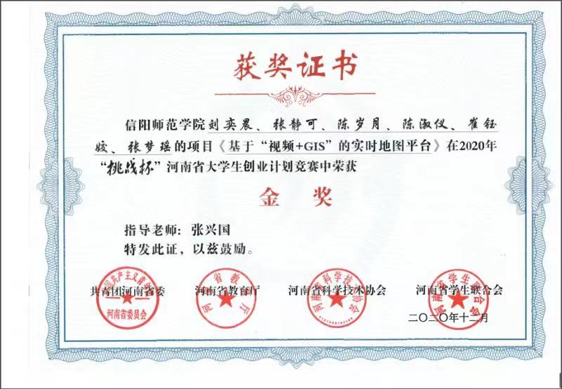 由共青团河南省委、省教育厅、省科技厅等单位主办的第十五届“挑战杯”河南省大学生课外学术科技作品竞赛终审决赛落下帷幕。永利官网张兴国老师指导,晨、张静可、陈岁月、陈淑仪、崔钰姣、张梦瑶团队完成的大学生创业计划《基于“视频+GIS”的实时地图平台》,经过学院、学校层层筛选,从众多作品中脱颖而出,成为代表我校参赛的作品之一,并荣获金奖。